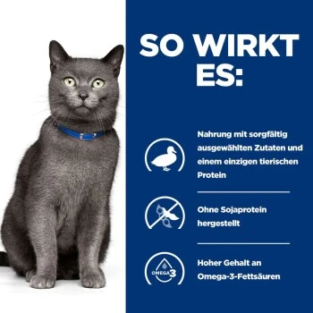Hill’s Prescription Diet d/d Feline Ente und grüne Erbsen wurde entwickelt, um zu helfen, allergische Reaktionen auf Futter zu reduzieren und die Hautgesundheit zu unterstützen.